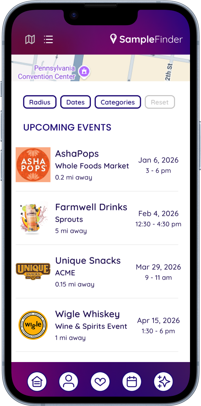 SampleFinder will share events in your area where you can stop by and get free samples of new foods and beverages along with merch, discounts and more! We know shoppers love to try before they buy, and with SampleFinder you’ll experience the newest products and services right in your area!